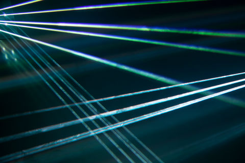 반사형 디스플레이, 기하학적 그래픽, 빛, 그리고 분해와 결합을 반복하는 비주얼을